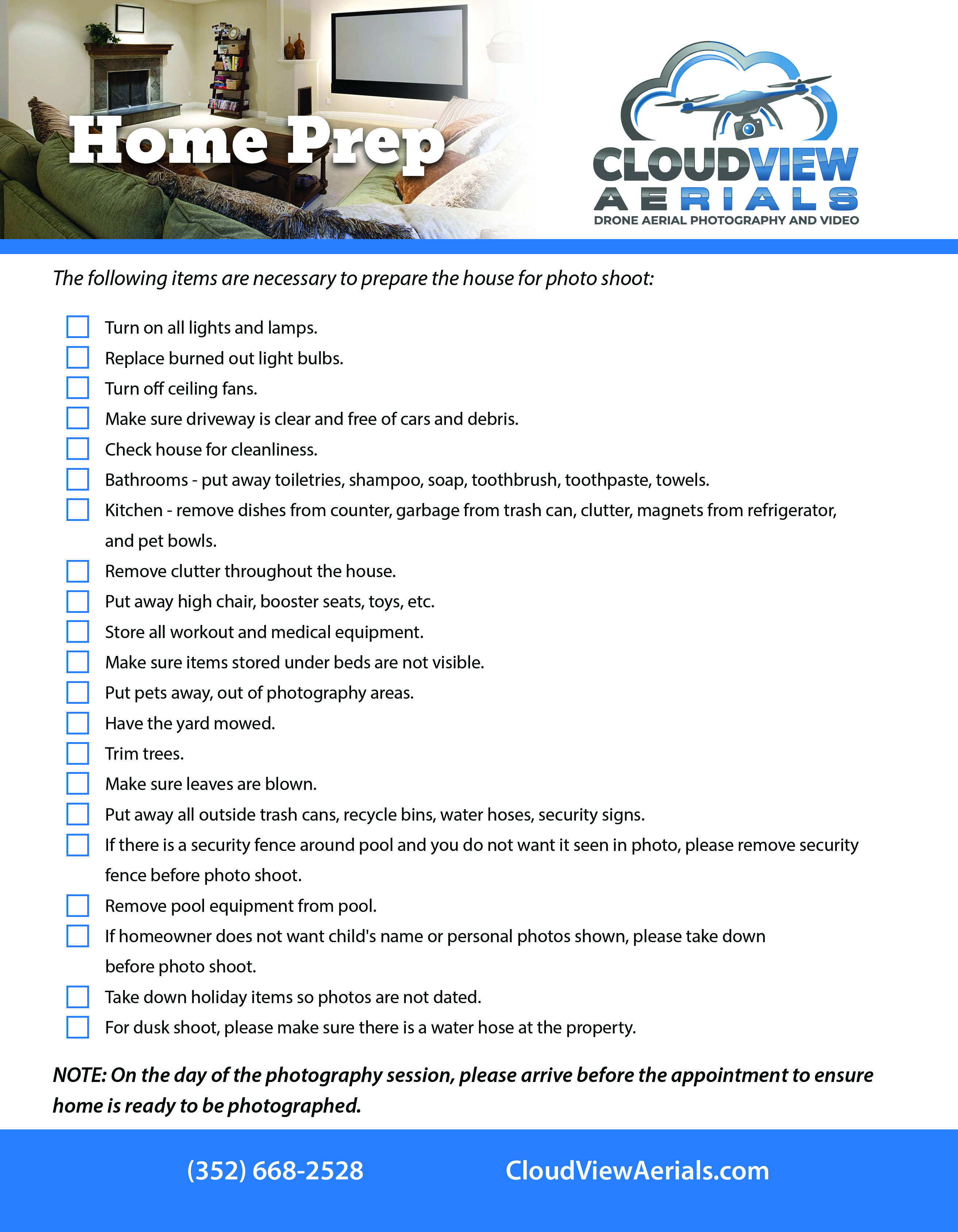 After setting an appointment with CloudView Aerials, please review the home preparation flyer to ensure your property is ready for the photo shoot. Here you will see all those requirements for photography